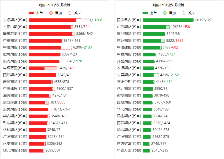 总体而言,鸡蛋2601合约今日增仓上行,多空持仓排名前20席中,多空双方均呈退场态势,多头退场意愿强于空头。