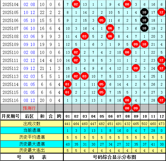 和值跨度:上期和值开出75,对比第2025115期和值下降了10个点位,本期预计和值在大号区域热出,看好出现在93周围。