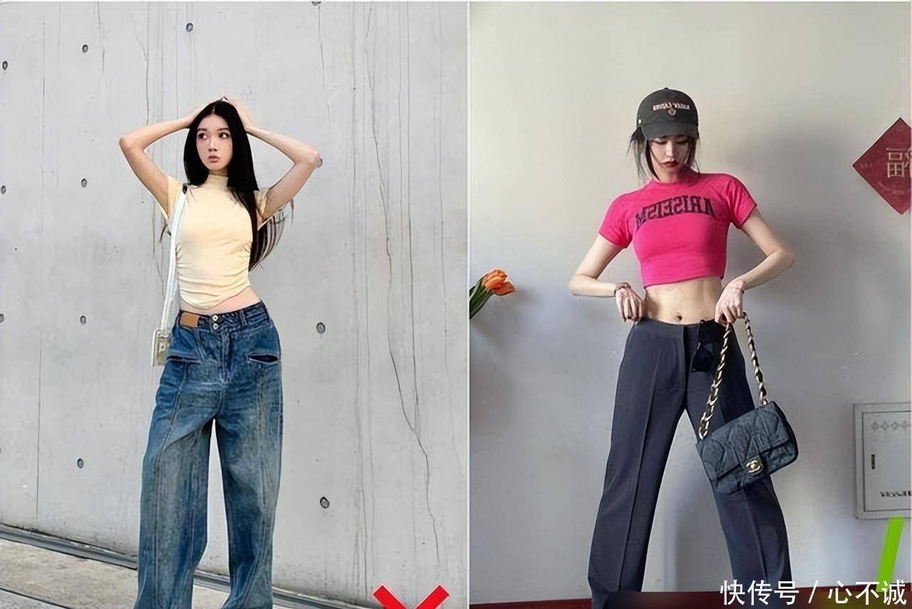 其实真的是没选对!比如我闺蜜之前说“低腰裤是瘦子专利”,结果我拉她去试了条裆线高的低腰牛仔,配短款卫衣,她160cm的个子,居然穿出了165的既视感!现在她天天穿低腰裤,说“比阔腿裤好搭一百倍”!