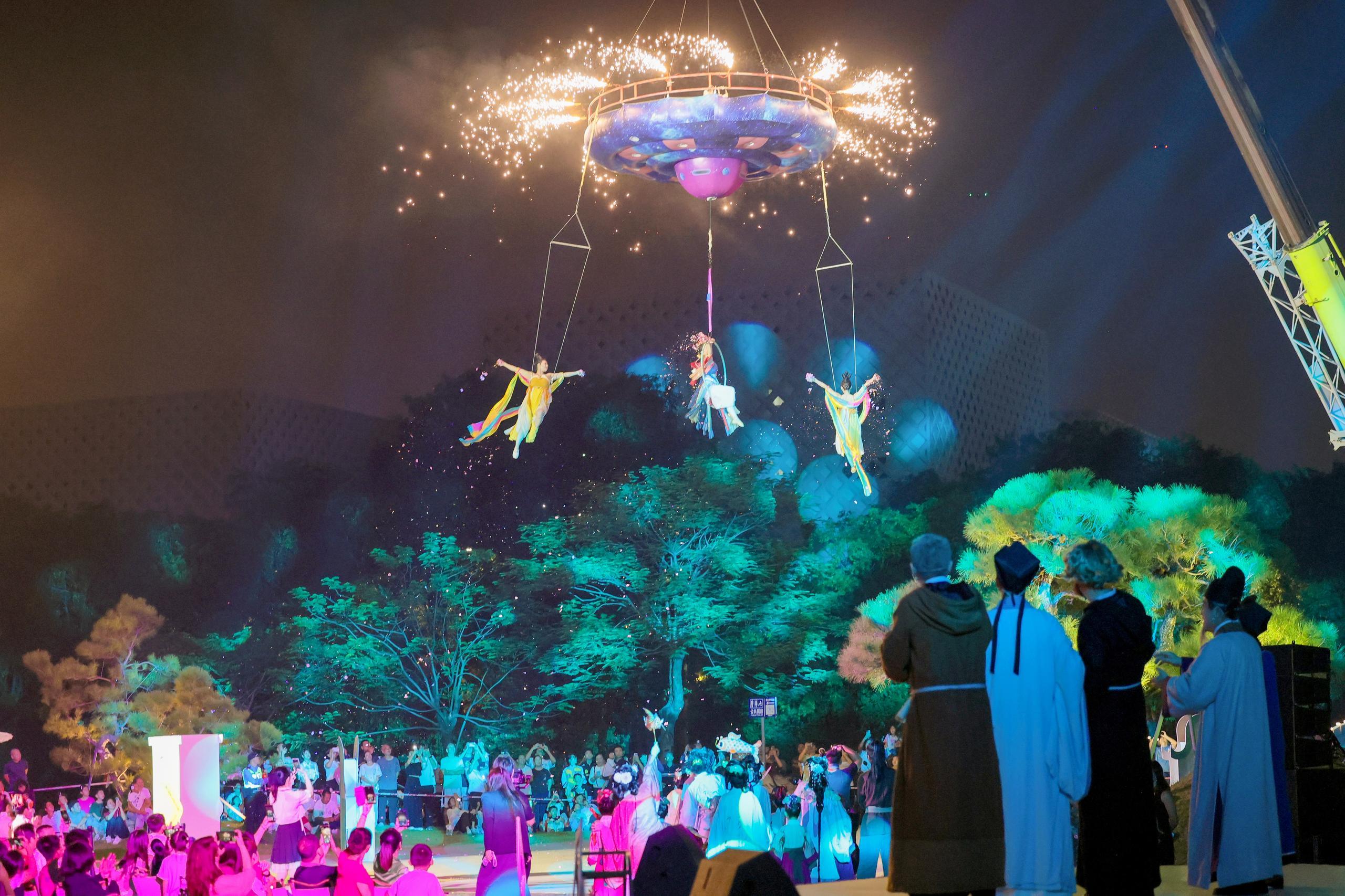 烟花绚烂,衣袖翩跹,演员在漫天花雨中翩翩起舞。“这是中国式的浪漫!”台下,观众纷纷举起手机,记录这震撼一幕。