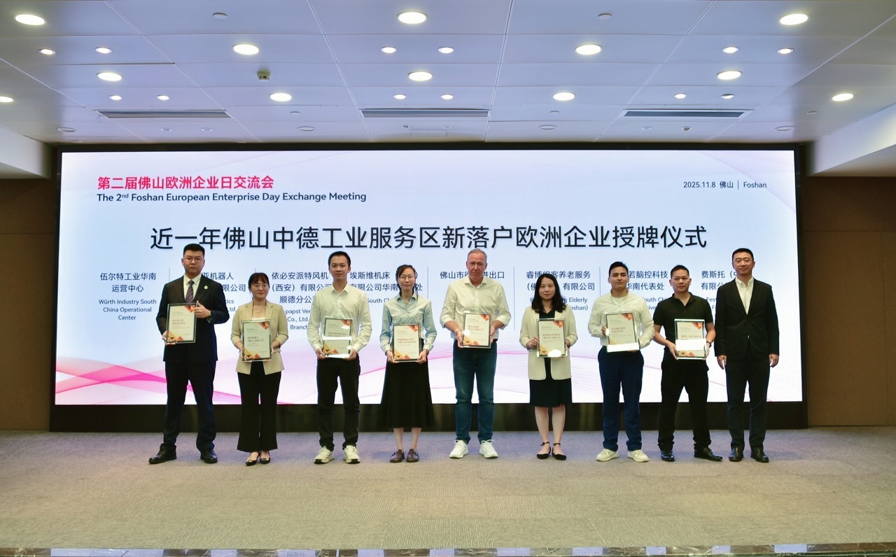 同一天,第二届佛山欧洲企业日交流会上,近一年来新落户中德工业服务区的8家欧洲企业接过了授牌。它们当中,有7家来自德国,1家为中荷合资,业务横跨机械装备、核心零部件、人形机器人、脑机接口等新兴赛道。